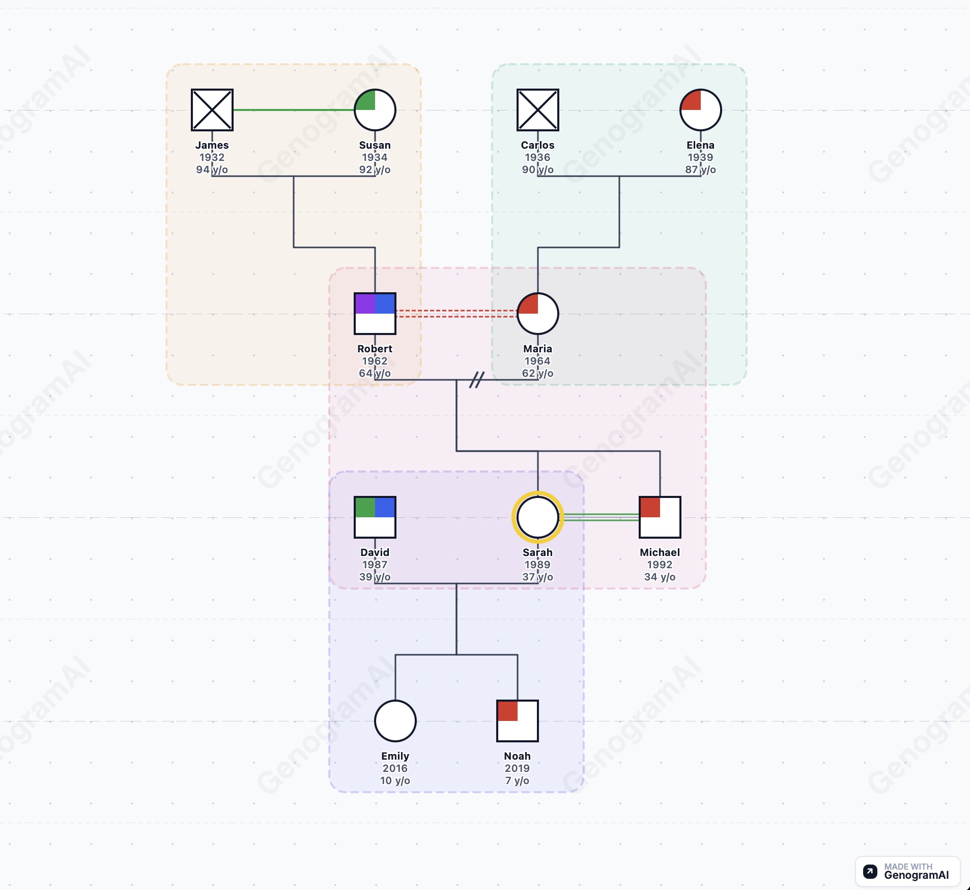 Absolutely! You can create your own genogram using GenogramAI. Start for free - just describe your family in words and the AI will generate a genogram like this one. You can then customize it with medical history, emotional relationships, and more.